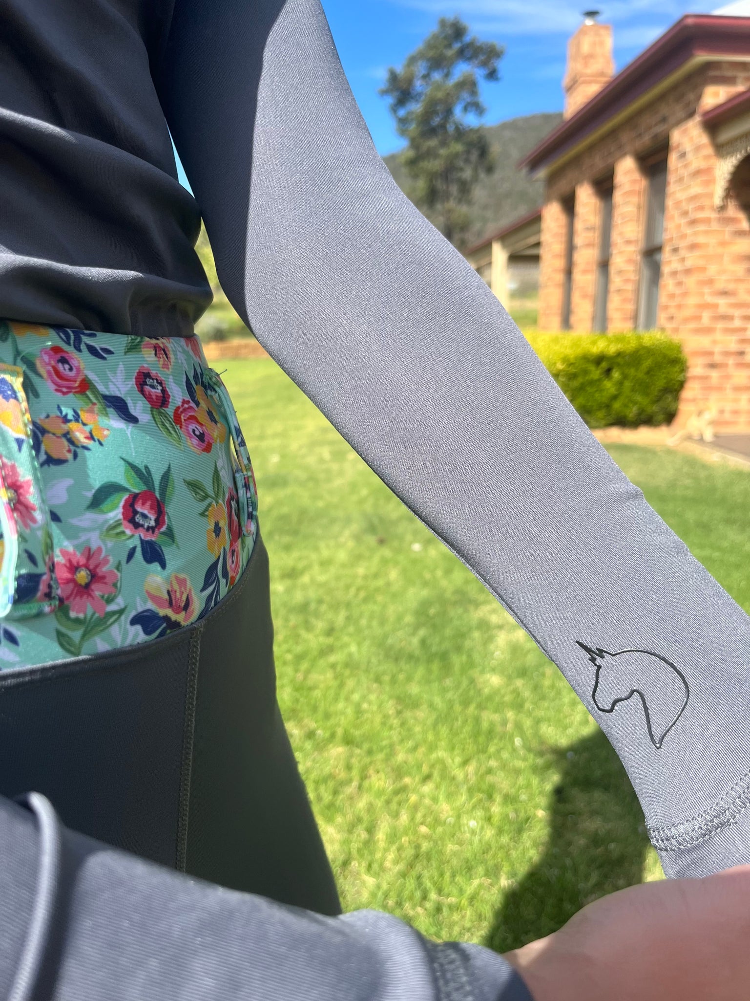 These gorgeous new baselayers are not only flattering but super comfortable! They feature sun safe material and a lucky unicorn on the sleeve.